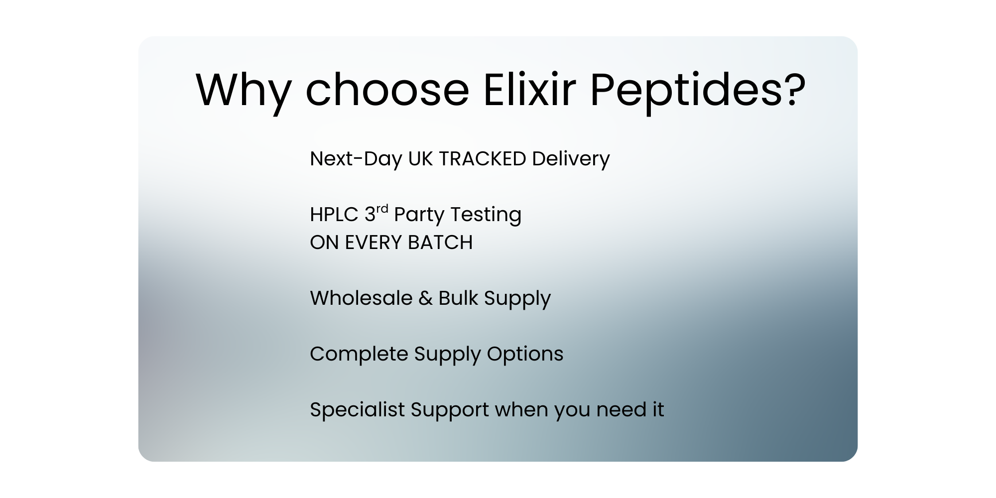 PRODUCTS SOLD ON ELIXIRPEPTIDES.CO.UK ARE FOR RESEARCH PURPOSES ONLY AND ARE NOT FOR HUMAN OR VETERINARY USE.